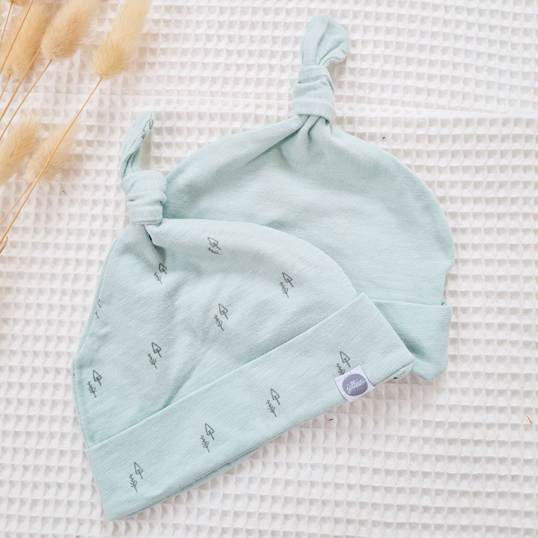 V kompletu dobite 2 zelo prikupni otroški kapici znamke Jollein v mint barvi. Kapici se na vrhu zavežete v vozel.