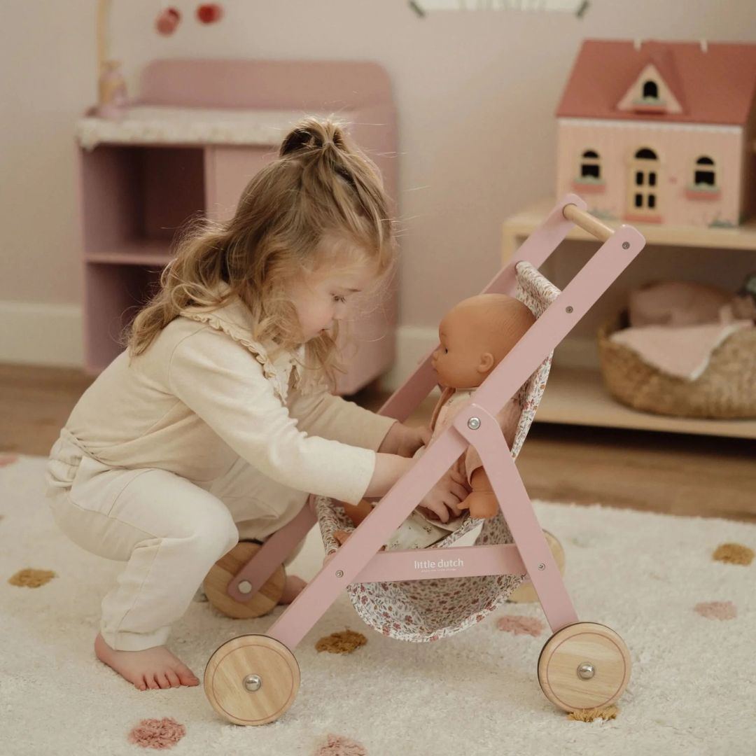 Naj se pustolovščina začne! Little Dutch leseni voziček za punčke je idealen spremljevalec za vse male mamice in njihove najljubše punčke. Z robustno leseno konstrukcijo in gumijastimi kolesi bo vsak sprehod gladek in varen – hkrati pa bo zaščitil vaša tla.