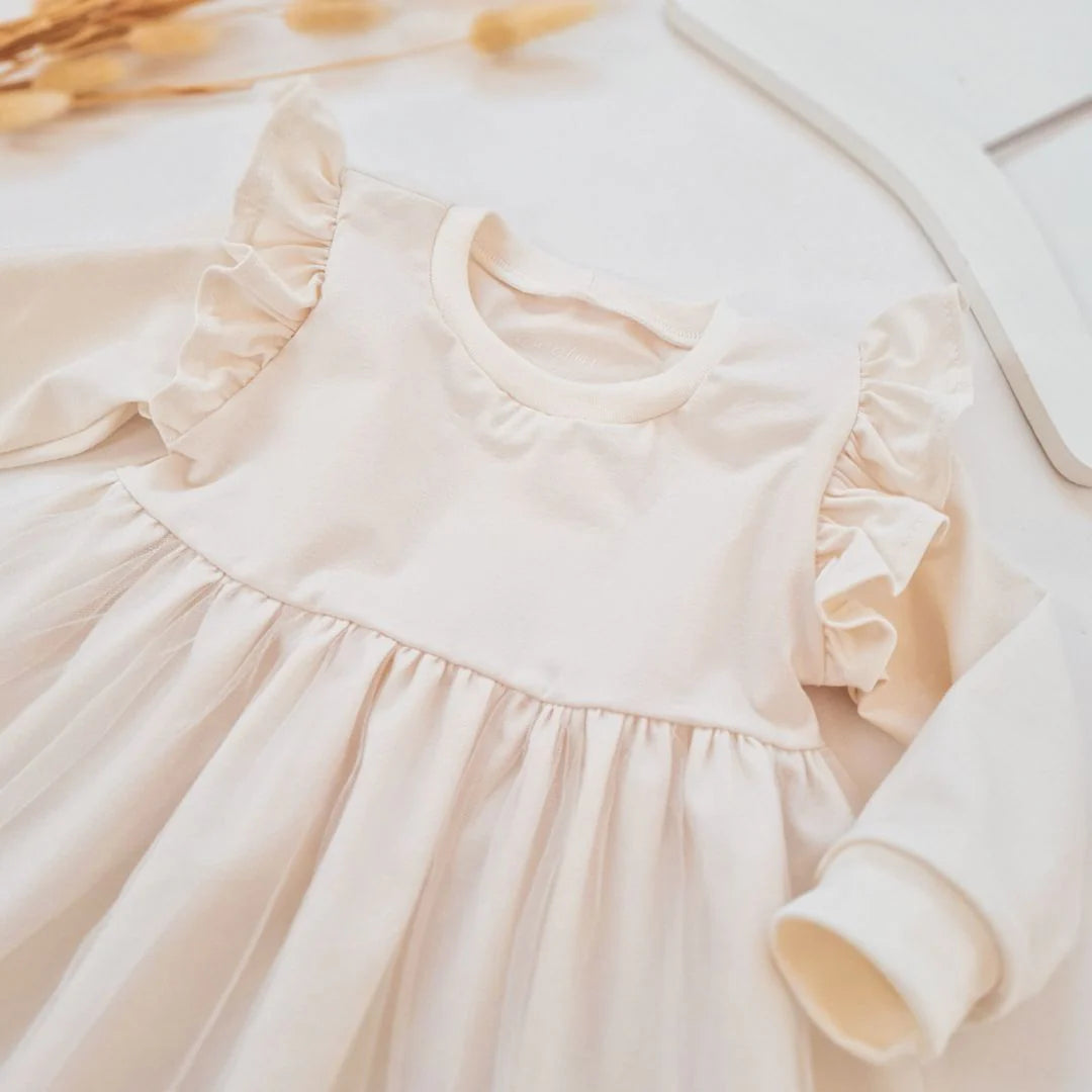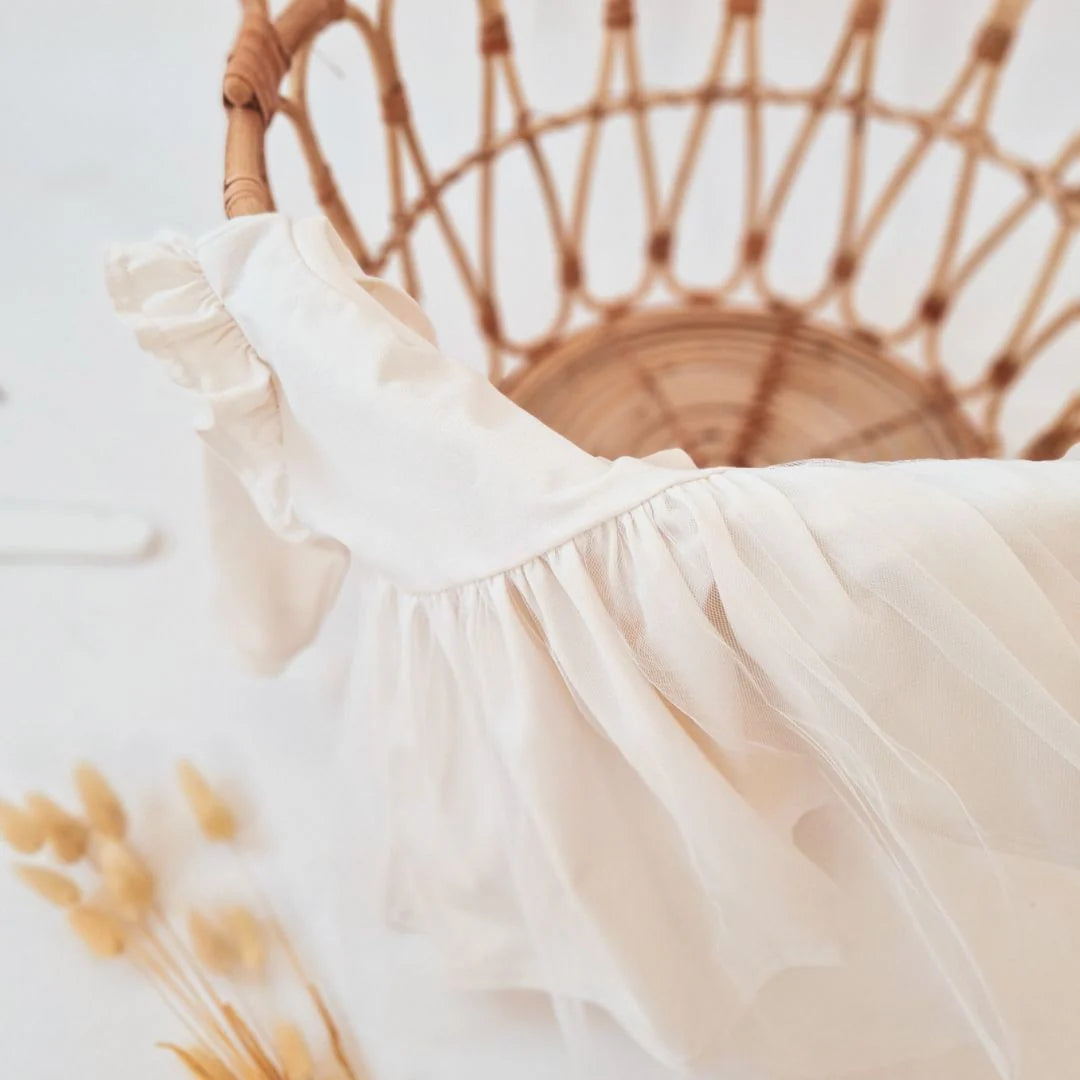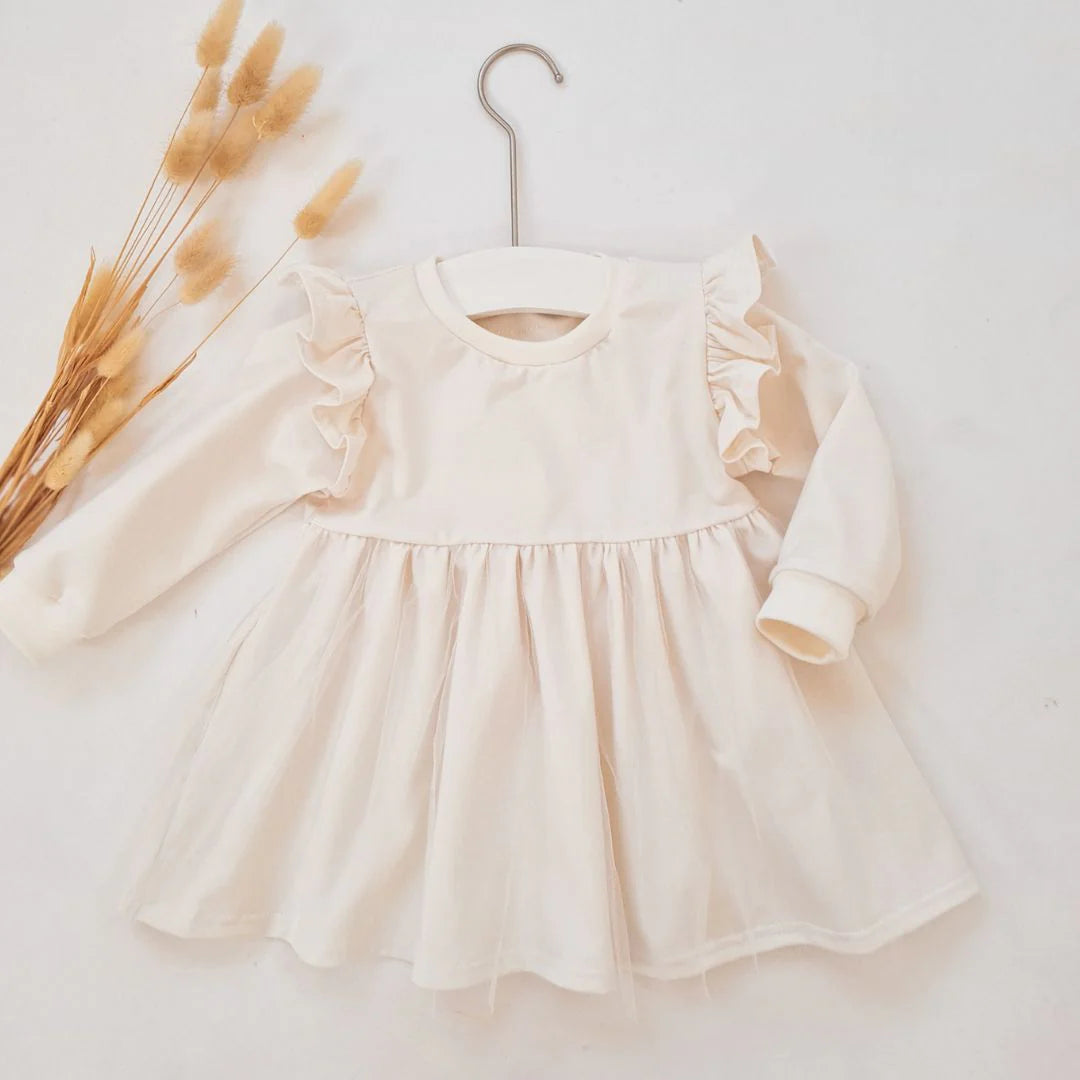 Oblekica za male gospodične. Na rokavih ima volančke. Čez krilo pa pride tli in naredi oblekico še bolj svečano.