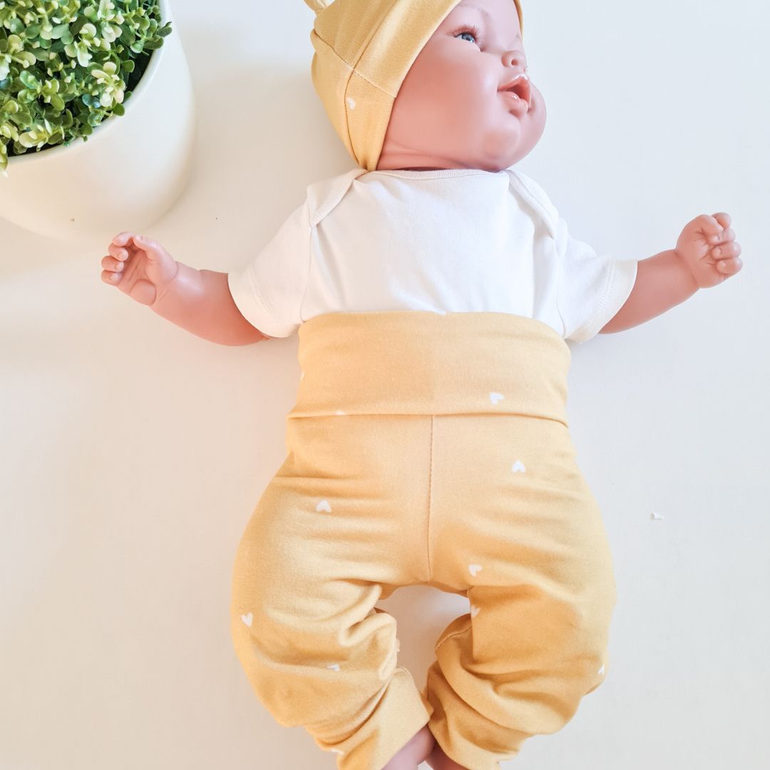 Kapica se zgoraj zaveže na ljubek vozel, hlače pa imajo širok pas, ki ga lahko zavihate ali odvihate, da lepo greje trebušček. Spodnji del hlač je zaključen s patentom, ki se ga prav tako lahko prilagodi, ko otrok zraste.